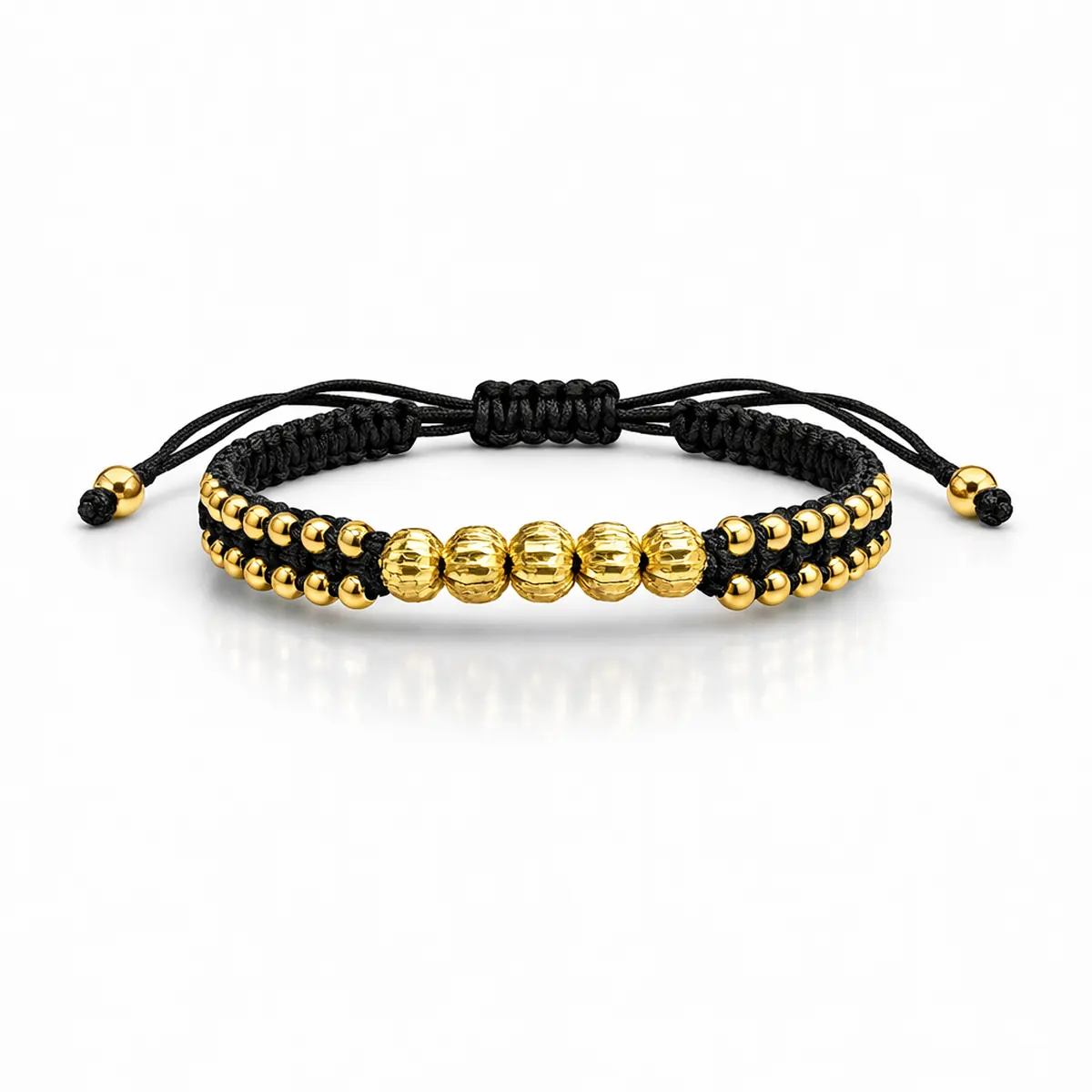 La pulsera en oro laminado con balines diamantado es una joya elegante y versátil que destaca por su brillo intenso, su diseño tejido en tono negro